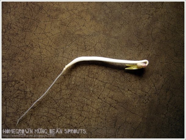 อยู่ปารีสมาตั้งนาน เพิ่งมาคิดปลูกถั่วงอกเอาไว้กินเองก็ตอนนี้ แถมยังลุ่มหลง เอามากๆขนาดว่าเช้าต้องเข้าไปเยี่ยมถั่ว เย็นต้องเข้าไปเยี่ยมถั่ว กลางคืนก่อนนอนยังต้องไปบอกราตรีสวัสดิ์มัน (เย๊ยยย) จนสามีน้อยใจแอบกัดแกมหยอกว่า เดี๋ยวนี้เป็นชู้กับถั่วงอกซะแล้วหรือ เอาใจมันเหลือเกิน แถมวันๆยังนั่งค้นข้อมูลในเน็ตอย่างเอาเป็นเอาตาย (ว่ะ ฮ่า ฮ่า ทำมาว่าเค้า เดี๋ยวได้กินถั่วงอกงามๆ ของเราแล้วติดใจ)เพราะว่าเอาถังเพาะถั่วงอกไปวางไว้ในตู้เก็บของในห้องน้ำเนื่องจากมันเป็นที่ๆเราคิดว่ามืดและอุ่นที่สุดในบ้านแล้ว ก็เลยต้องตามไปรดน้ำและแอบบแง้มฝาดูทุกวันว่ามันจะโตไหม จะกินได้หรือยัง เพราะตามที่เขาสอนมา เขาว่า4 วันก็เก็บเอาไปใส่ก๋วยเตี๋ยวกินได้แล้วแต่รอบแรกที่เราปลูก (ในครัว) 4 วันหางยังสั้นจุ๊ดจู๋อยู่เลย ต้องรอวันที่6 (ด้วยความระทึก เพราะเชิญเพื่อนมากินข้าวที่บ้าน จะผัดไทยให้หม่ำ กะอวดถั่วงอกปลูกเองกันวันนั้น) ถึงจะได้เก็บมากิน แต่ถั่วงอกเรา หัวโต ตัวลีบ แถมสั้นอีก ไม่เหมือนคนปลูกเอาซะเลย (ทั้งอวบ ทั้งบวม)